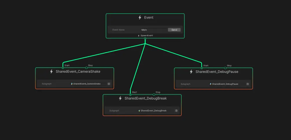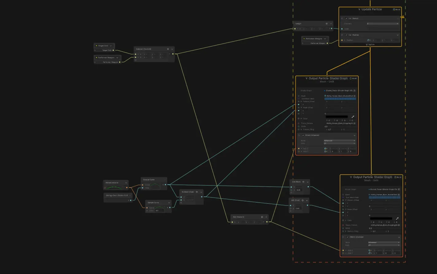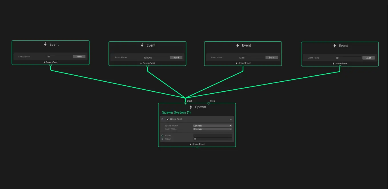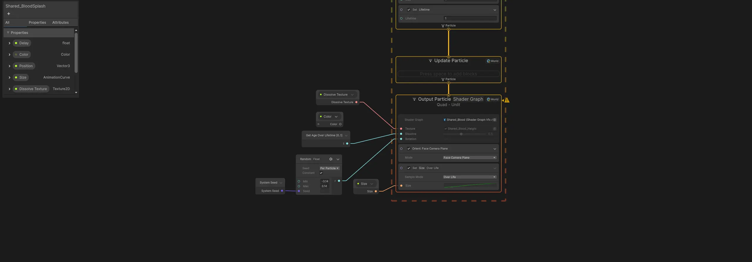 There is also some special output events which lets the VFX graph trigger logic outside of the graph. This is currently used for triggering camera shake, and debugging purposes like pausing the editor. Especially debug pausing the editor has been very useful for determining whether an event is invisible or simply isn’t triggered in the first place, and for inspecting the character animator to see if an event gets culled by mistake.