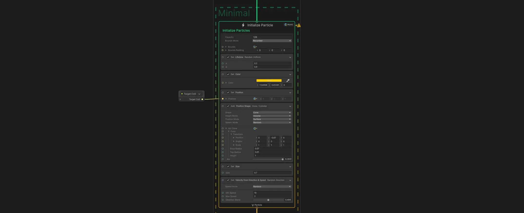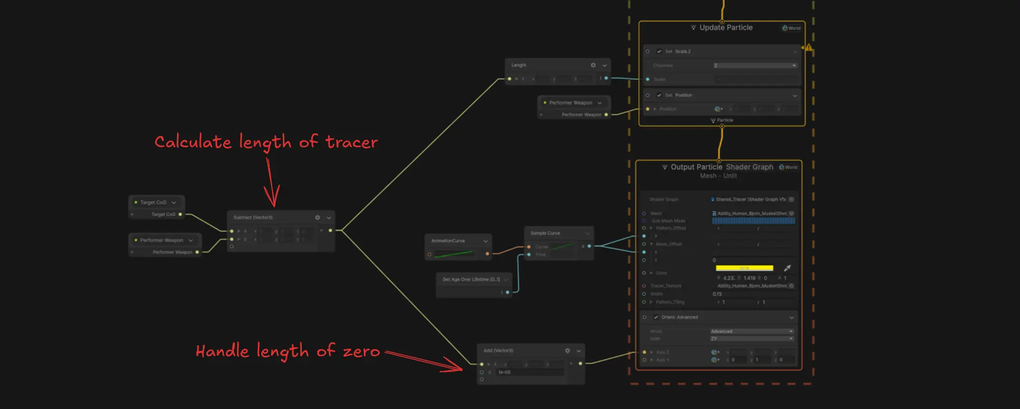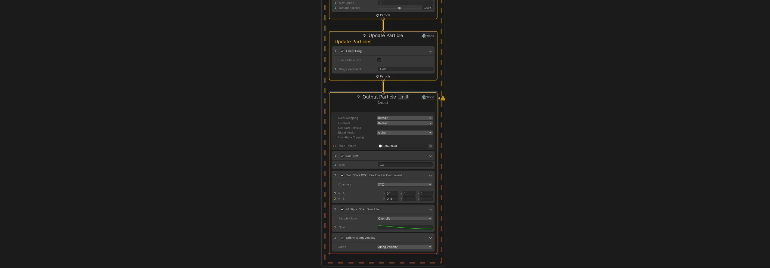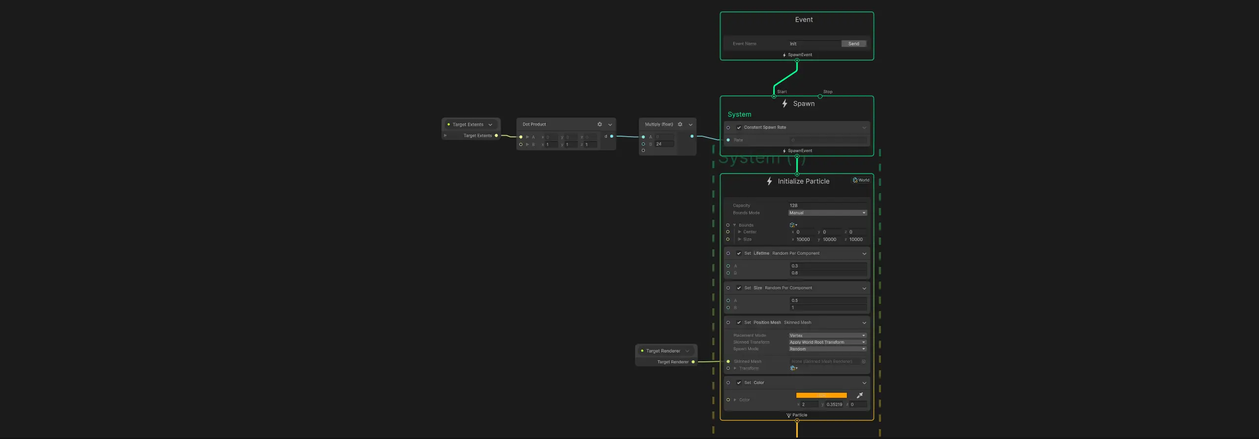 There is also some special output events which lets the VFX graph trigger logic outside of the graph. This is currently used for triggering camera shake, and debugging purposes like pausing the editor. Especially debug pausing the editor has been very useful for determining whether an event is invisible or simply isn’t triggered in the first place, and for inspecting the character animator to see if an event gets culled by mistake.