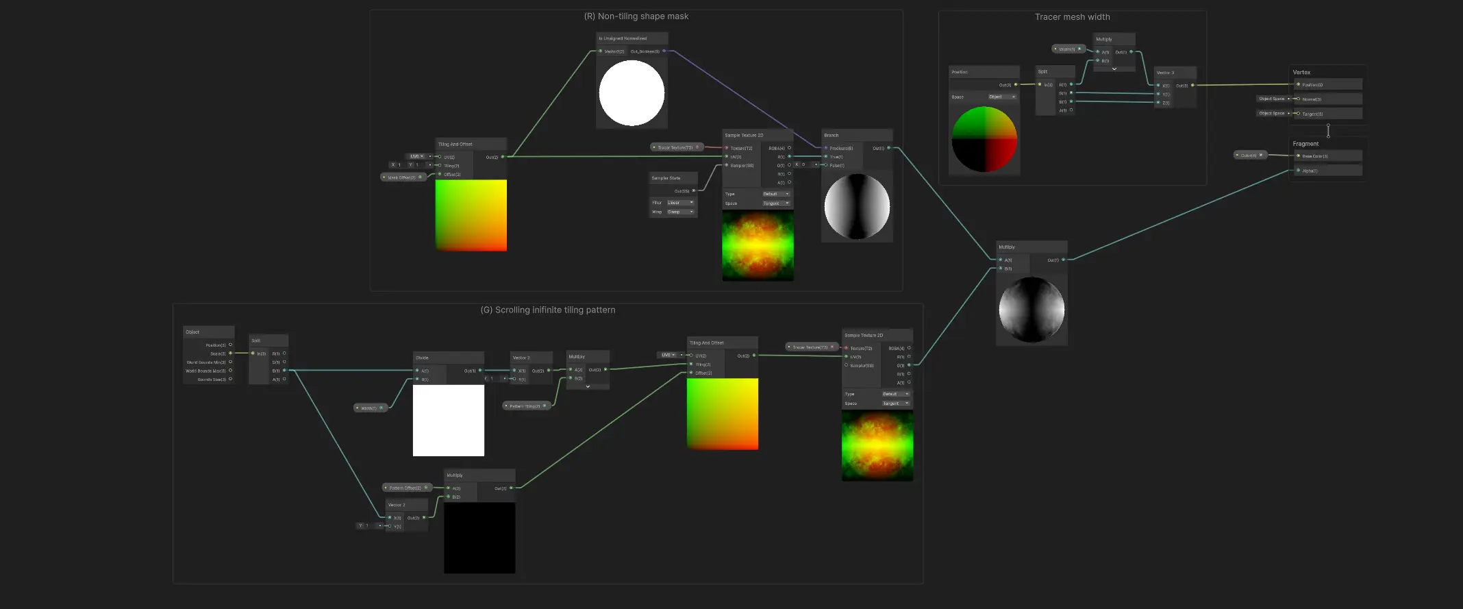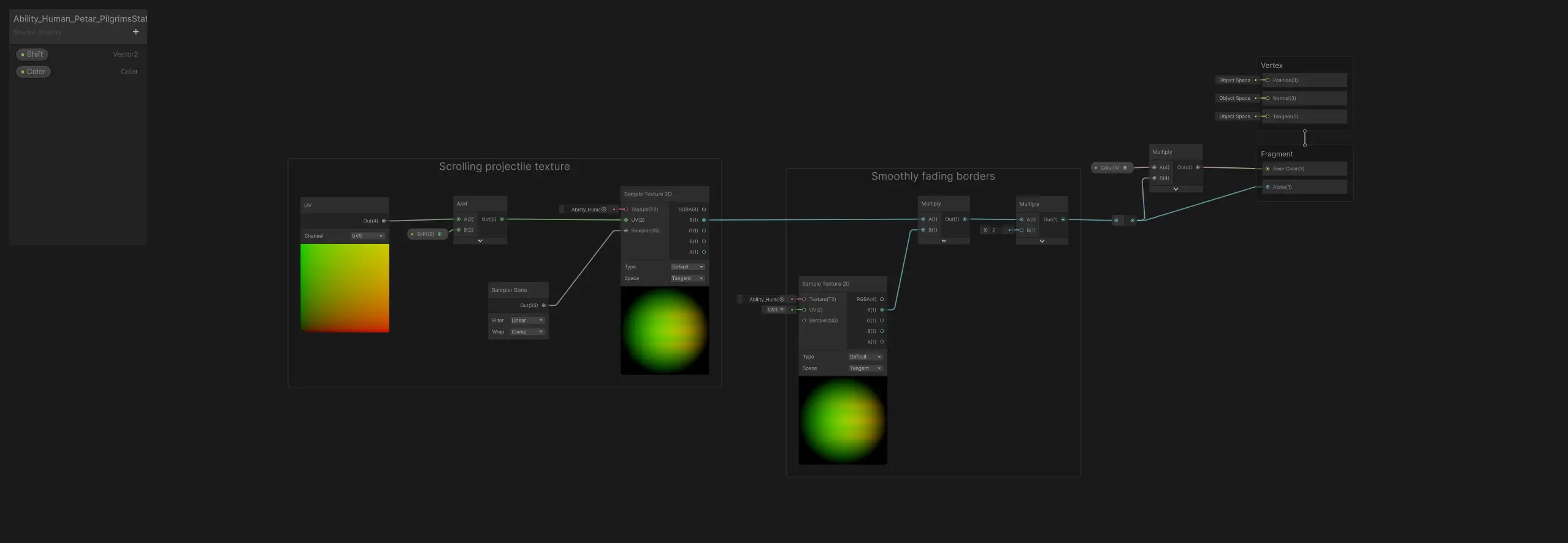 The melee swing uses scrolling UVs for the main projectile and some bloom