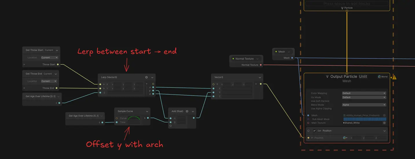 Projectiles reuse a subgraph that primarily creates an arch and adds some angular rotation to a model, and an extra explosion effect