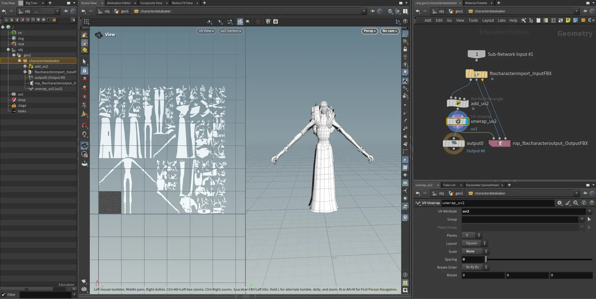 The character UV generator was created since some asset packs had models which were UV-mapped for gradient atlas texturing. The HDA simply unwraps the UV set and stores it unnormalized in the second UV-set, so that VFX requiring tiling textures like the blood texture can work across all characters.