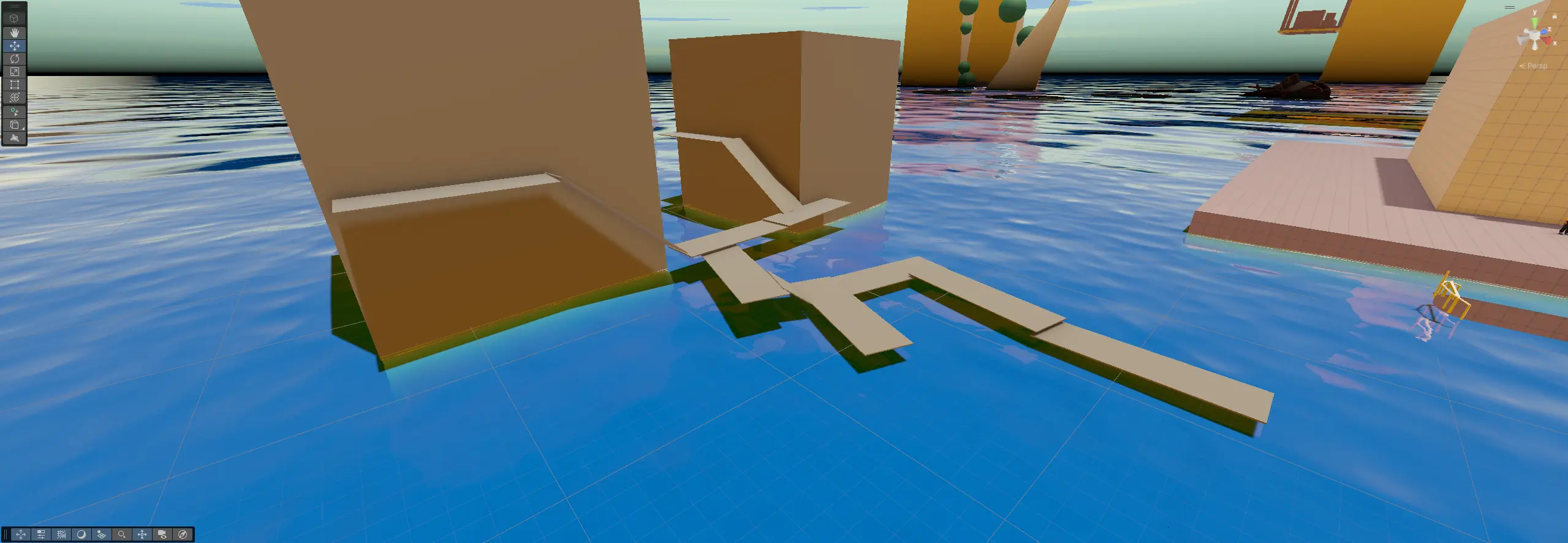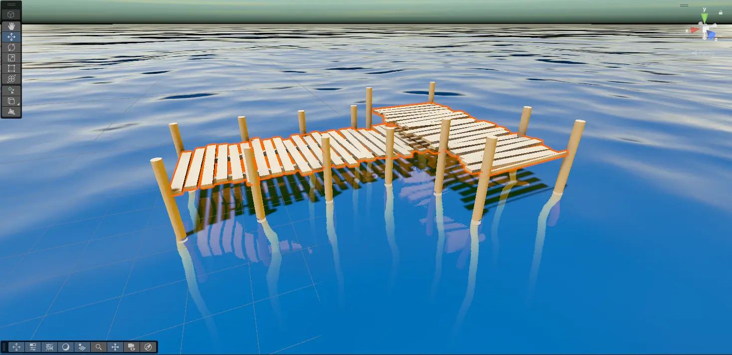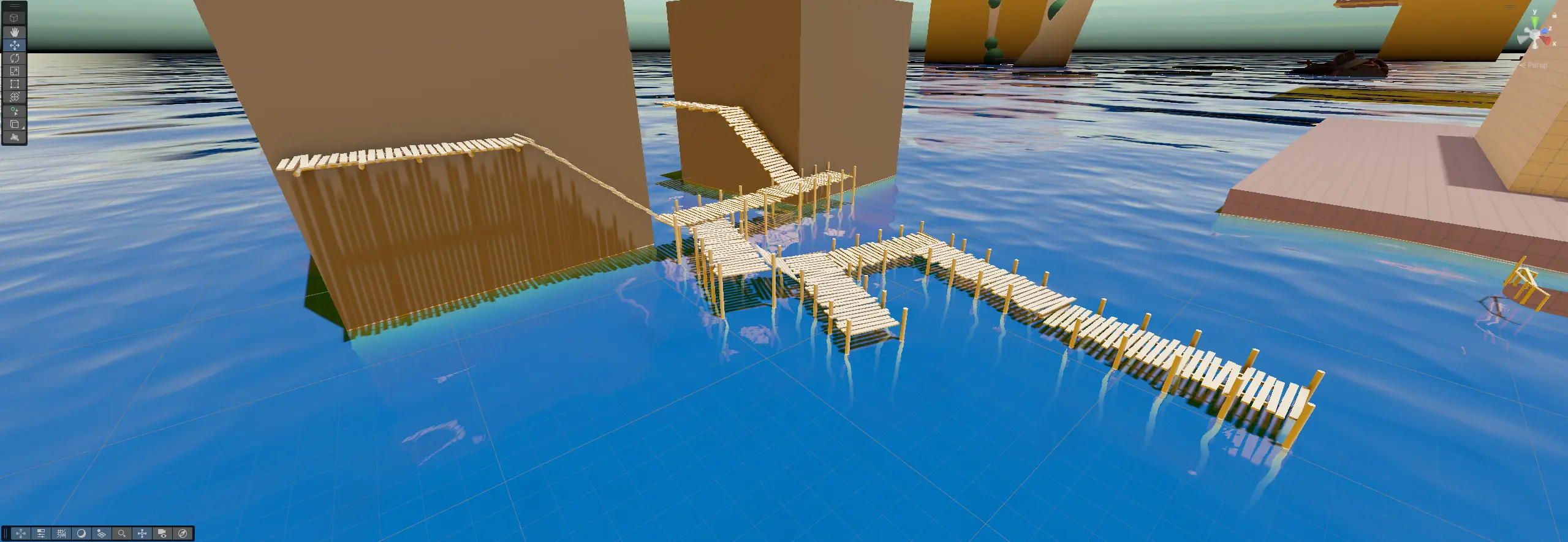 The jetty HDA was intended to be used for settlements, but alas it only reached the blockout stage. The level designer builds the intended walkable area and the HDA then generates planks and poles to fit.