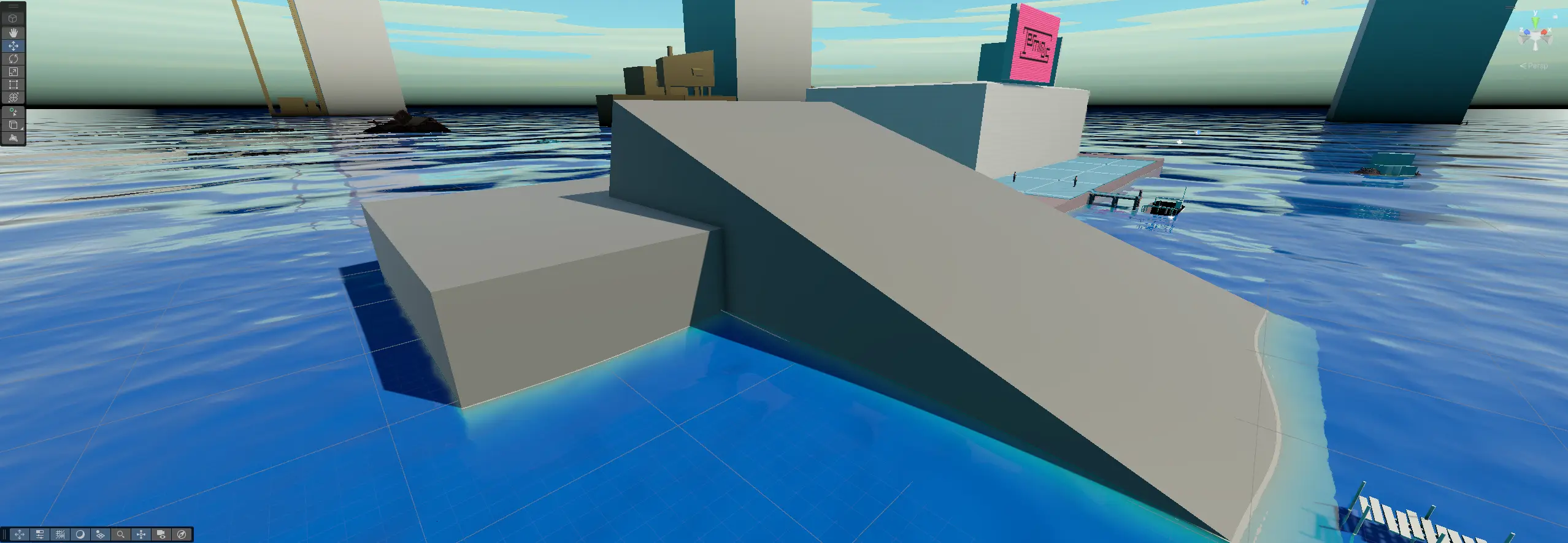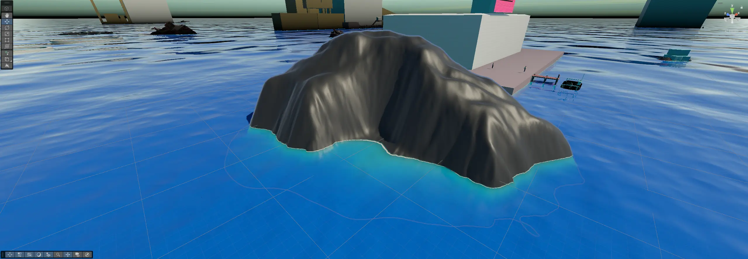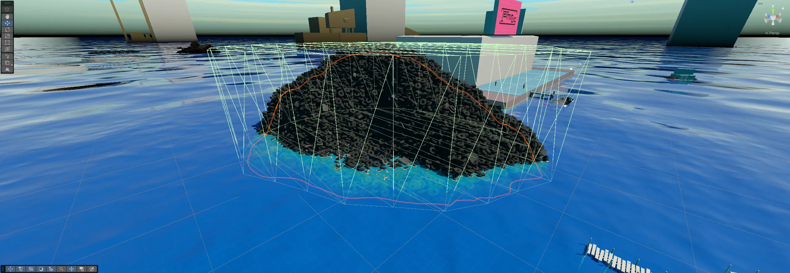 The jetty HDA was intended to be used for settlements, but alas it only reached the blockout stage. The level designer builds the intended walkable area and the HDA then generates planks and poles to fit.