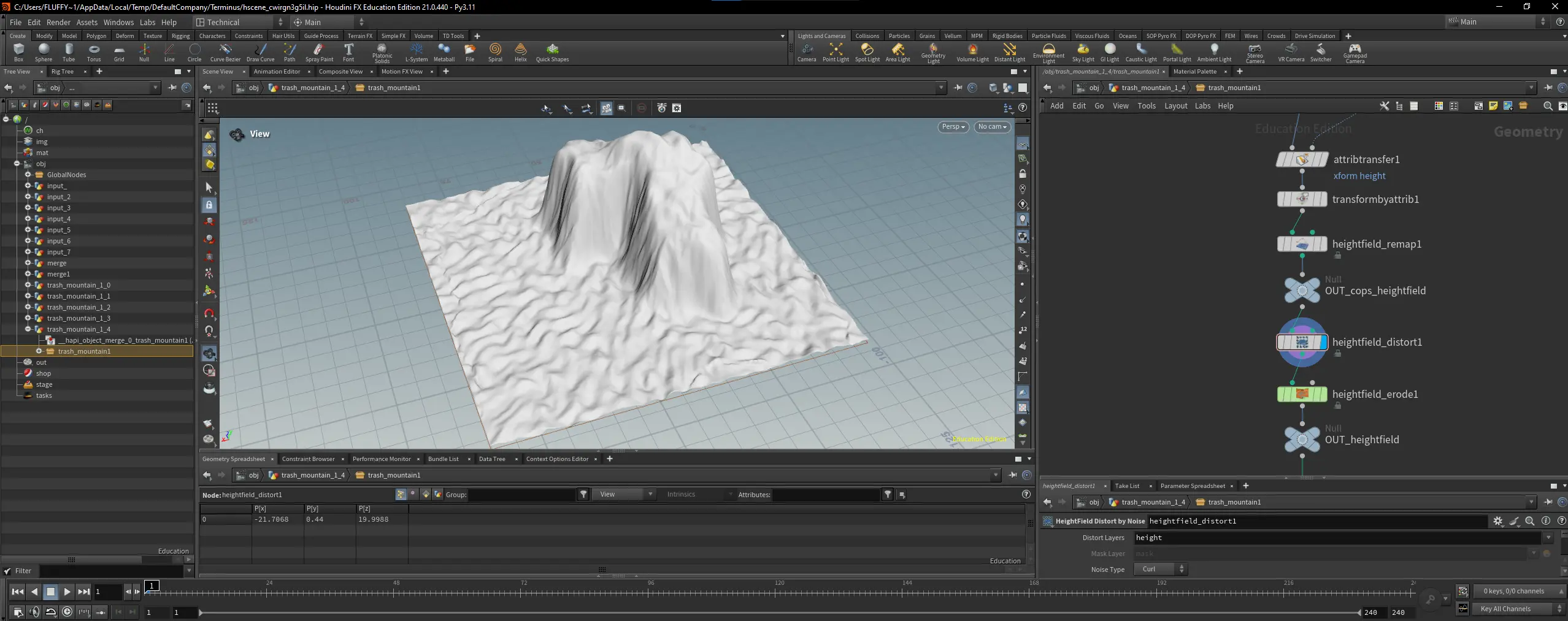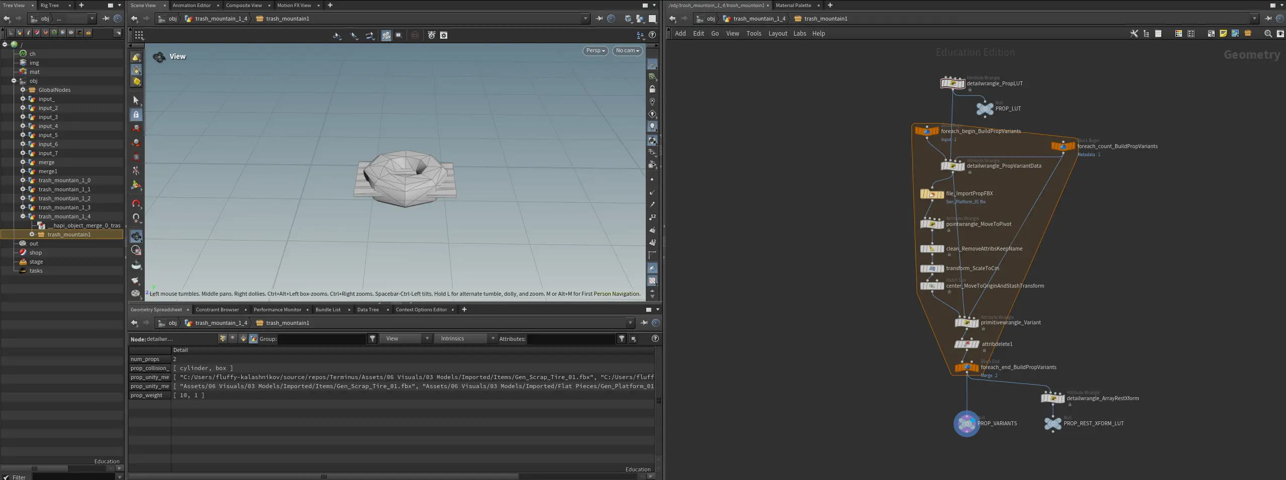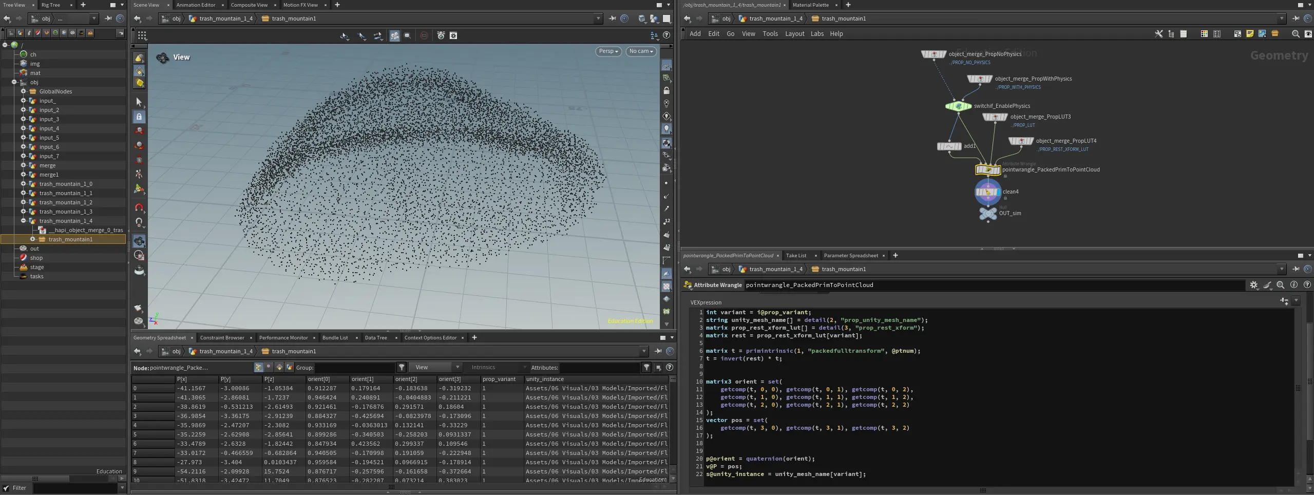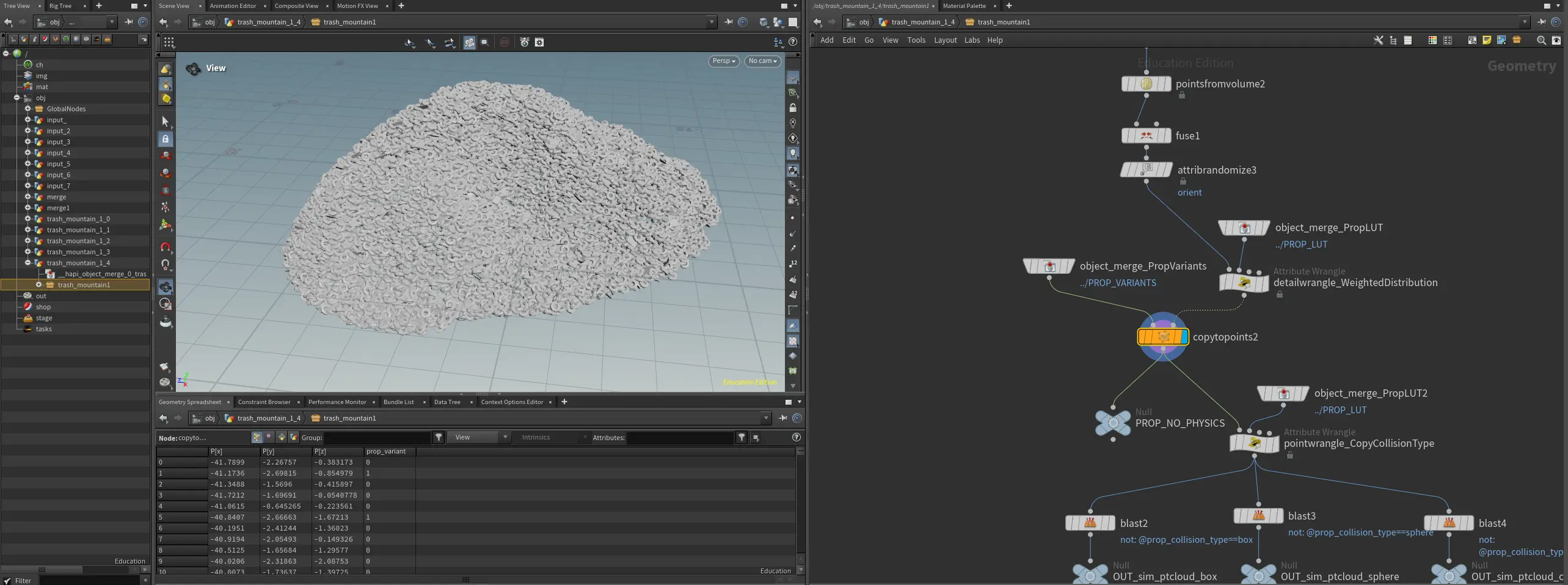 The trash mountain HDA generates an underlying mountain and adds trash props on top. It also generates a simplified collision mesh. The trash props are weighted and can be adjusted with seeds.