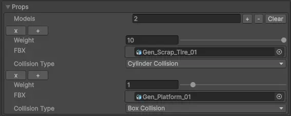 To randomize the props a prop_variant attribute is set for each point on a point cloud, where the odds of setting a specific variant is distributed by weight. It builds an array which is randomly indexed where in this case 10 elements of the array refers to variant 0 and only 1 element refer to variant 1.