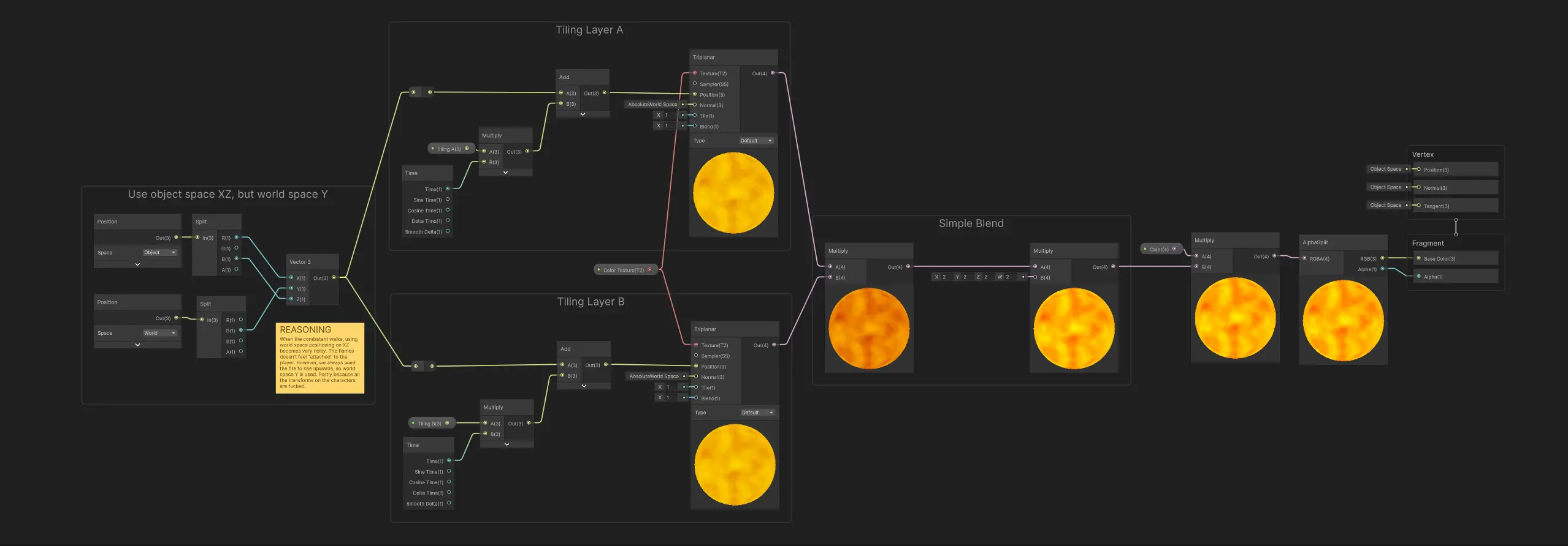 Aflame uses scrolling triplanar texture sampling for the character itself, and uses mesh sampling to spawn additional fire particles around the characters limbs. The triplanar texture sampling uses local positions except for the Y-axis to make it feel attached to the character