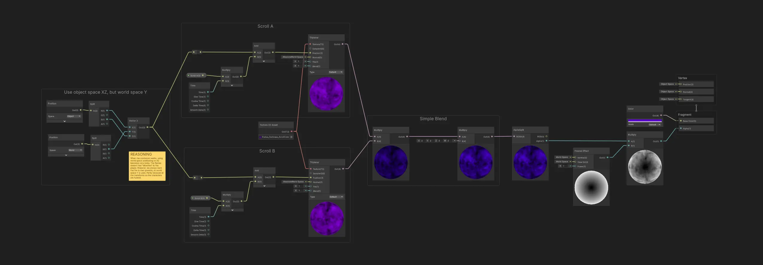 Darkened uses double layers of scrolling triplanar texture sampling, and a fresnel to keep the character recognizible
