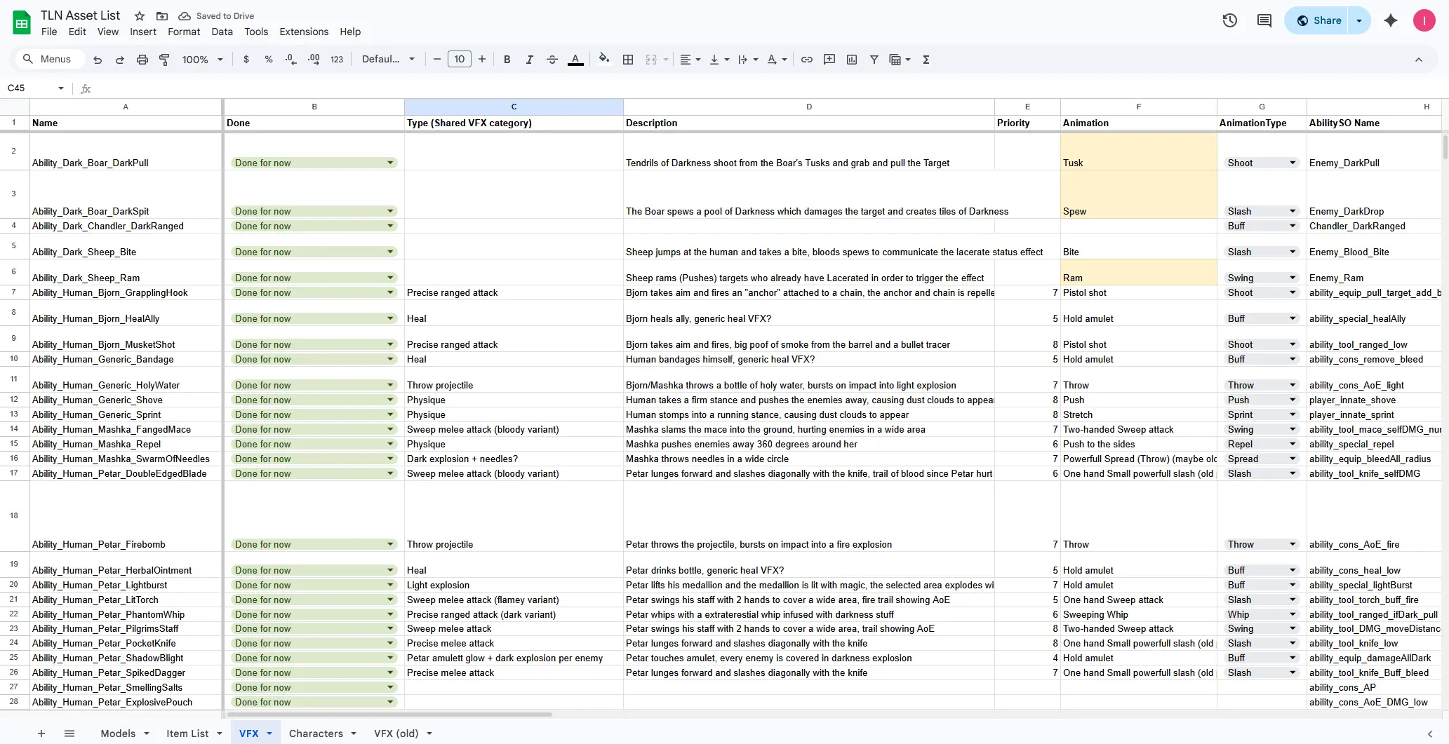 In terms of planning for VFX not much had been done before I joined, but I tried to do the best of the situation and organized excel sheets of items, abilities, status effects and other stuff that had to be made. This was done in the other projects as well.